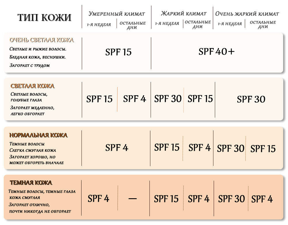В зависимости от фототипа кожи, солнцезащитные средства подбирают следующим образом: