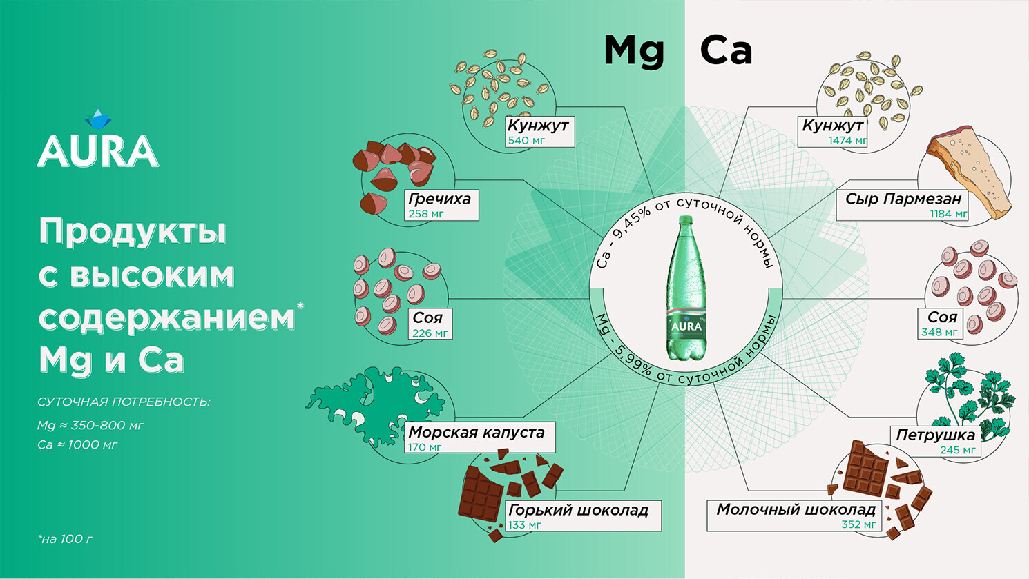 Минерализованная вода AURA обогащена кальцием — 10% от суточной нормы — и магнием — 8,8% от суточной нормы). Кальций плохо усваивается в организме без магния. Именно поэтому необходимо соблюдать баланс этих минералов.