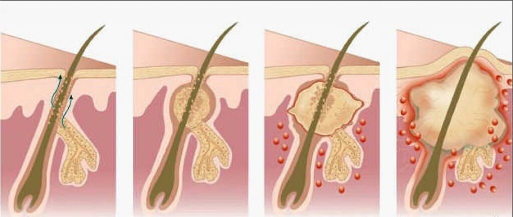 - Инфильтрация. Вокруг устья волосяного фолликула появляется ярко-красный инфильтрат, который постепенно увеличивается в диаметре до 103 см. Образование уплотняется, появляется боль и отечность, ощущение покалывания.