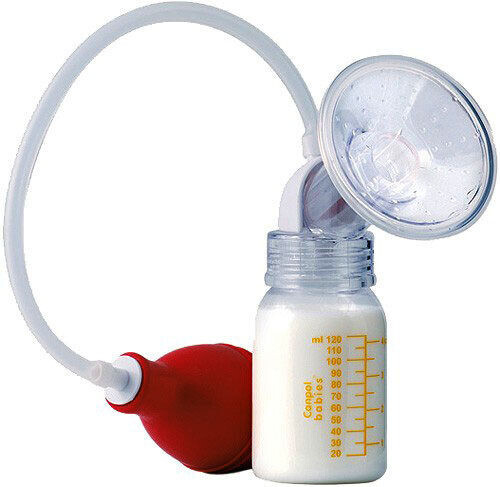 1. Помповый и молокоотсос с грушей. Одни из самых дешевых вариантов. Но, пожалуй, это единственный плюс. Они выглядят как воронка для груди с грушей (в единичных современных моделях предусмотрено крепление для бутылочки). Сцеживать этими молокоотсосами довольно тяжело физически, из-за этого снижается и продуктивность. Простерилизовать резиновую грушу тоже проблематично (при термической обработке резина быстро выходит из строя), поэтому и создавать запасы молока не получится. А частое использование таких молокоотсосов приводит к трещинам сосков.