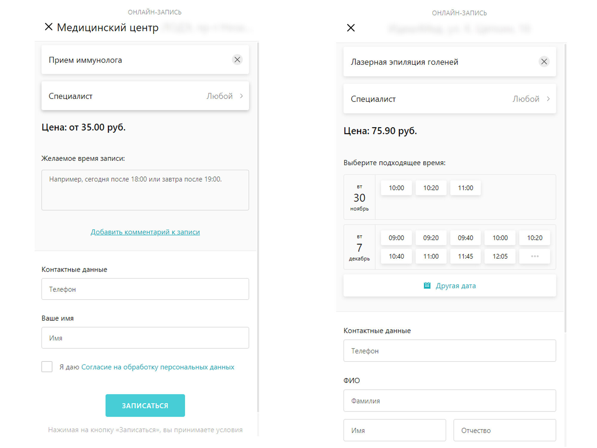 Это персональная форма онлайн-записи для клиник. Может работать на отдельной странице по ссылке или встраиваться на сайт медцентра. В сервисе уже внесена вся информация о направлениях, услугах, ценах и врачах. Пациенту достаточно выбрать нужное из списка и оставить свои пожелания по времени приема. Форму можно использовать: