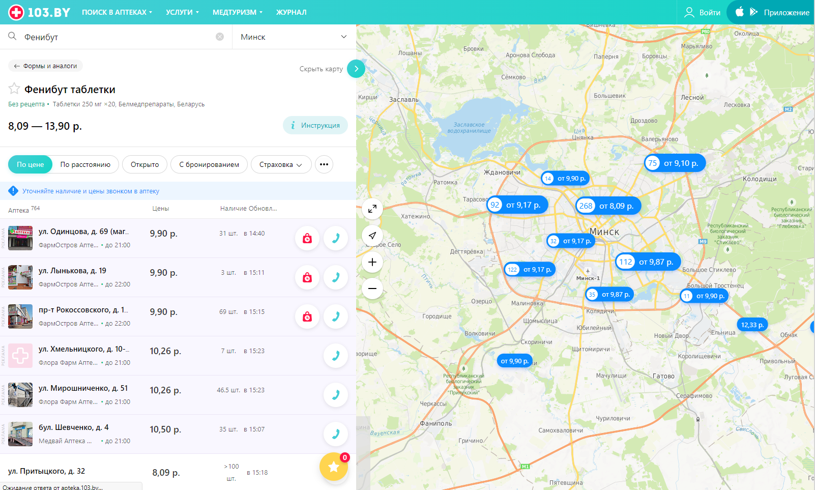 К сервису поиска лекарств подключены более 4 000 аптек по всей Беларуси, и их количество постоянно растет. Любой пользователь легко может найти нужное лекарство по минимальной цене в выбранном регионе. Также аптеки могут сортироваться по близости к текущему местонахождению пользователя и отображаться на карте.