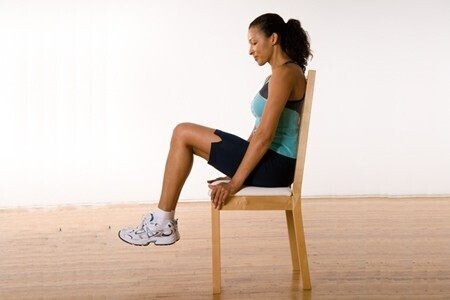 Обопритесь руками о край кресла, выпрямите ноги перед собой на полу. Медленно опуститесь почти до пола, вернитесь в исходное положение. Повторите 5-15 раз.