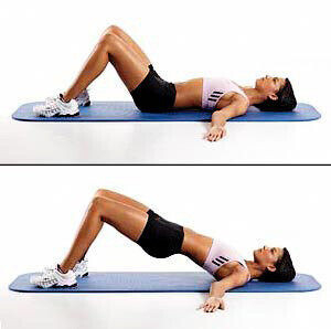 Как делать: лежа на спине, ноги согнуты в коленях, руки лежат на полу. Выталкивайте таз вверх до образования прямой линии с корпусом. Задержитесь в таком положении пару секунд и опуститесь. Сделайте три подхода по 20 раз.