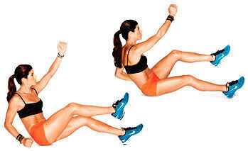 Как делать: садитесь на пол, поместив чуть согнутые ноги перед собой. Отклонитесь назад и оторвите ступни от пола. Левой рукой тянитесь вверх, будто пытаетесь схватиться за трос при восхождении по скале, одновременно поднимая правую ногу выше левой. Медленно поменяйте руки местами, синхронно с аналогичным движением ног. Во время всех телодвижений вы должны явно ощущать работу всех мышц пресса и корпуса.