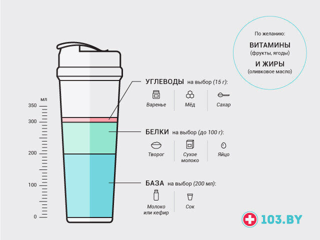 - Порция коктейля, особенно перед тренировкой, не должна быть больше 350 мл (300 — если консистенция напитка достаточно густая).