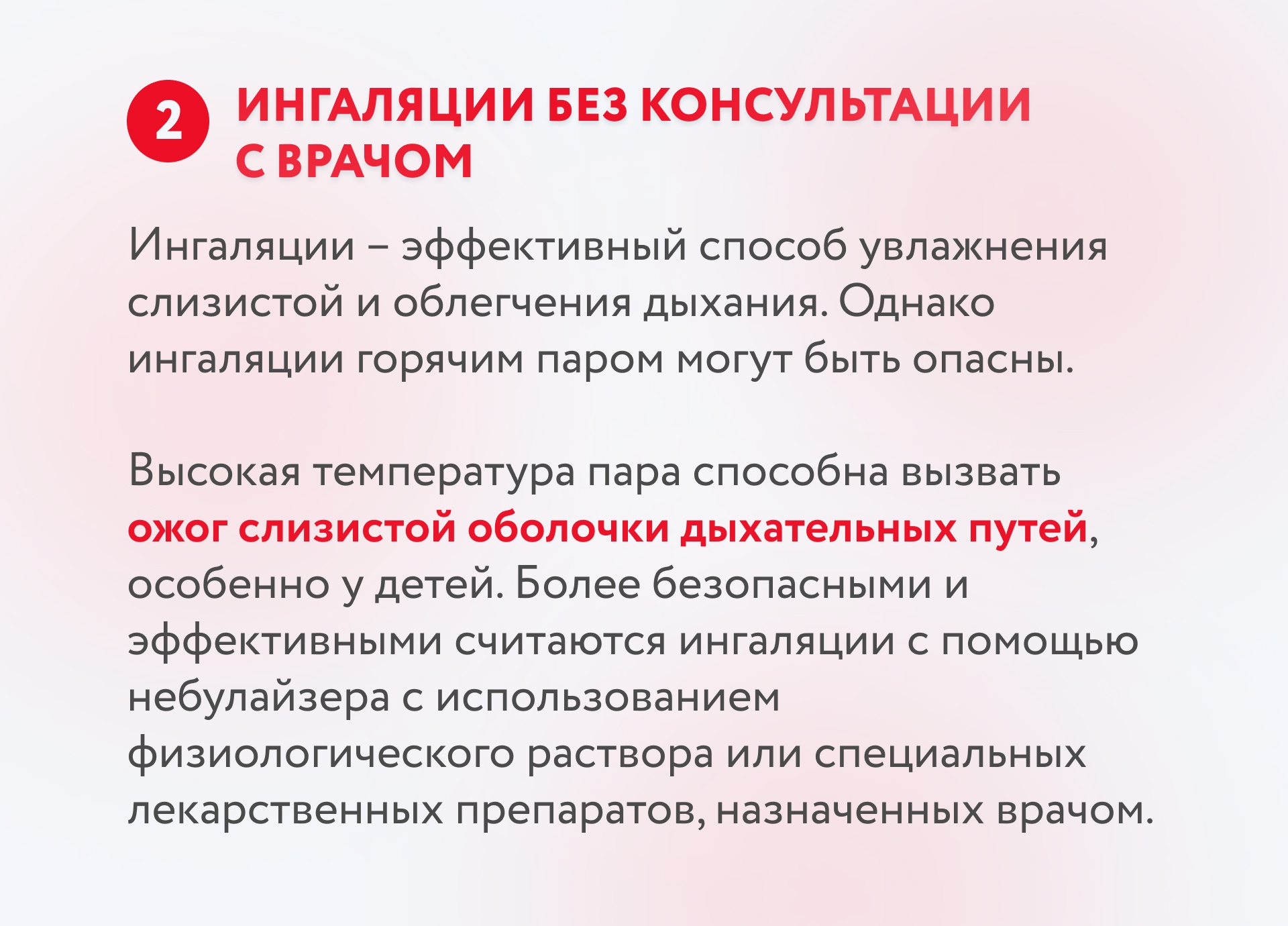 – Здесь нужно быть крайне осторожными. Как врач, не рекомендую использовать устаревшие методы вроде дыхания над паром и подобные – они могут повредить слизистую. Лучше для этих целей использовать небулайзеры, сегодня есть огромный выбор таких ингаляторов, некоторые из них достаточно бюджетны. При этом важно обращать внимание, какие именно средства производитель рекомендует использовать с тем или иным прибором.