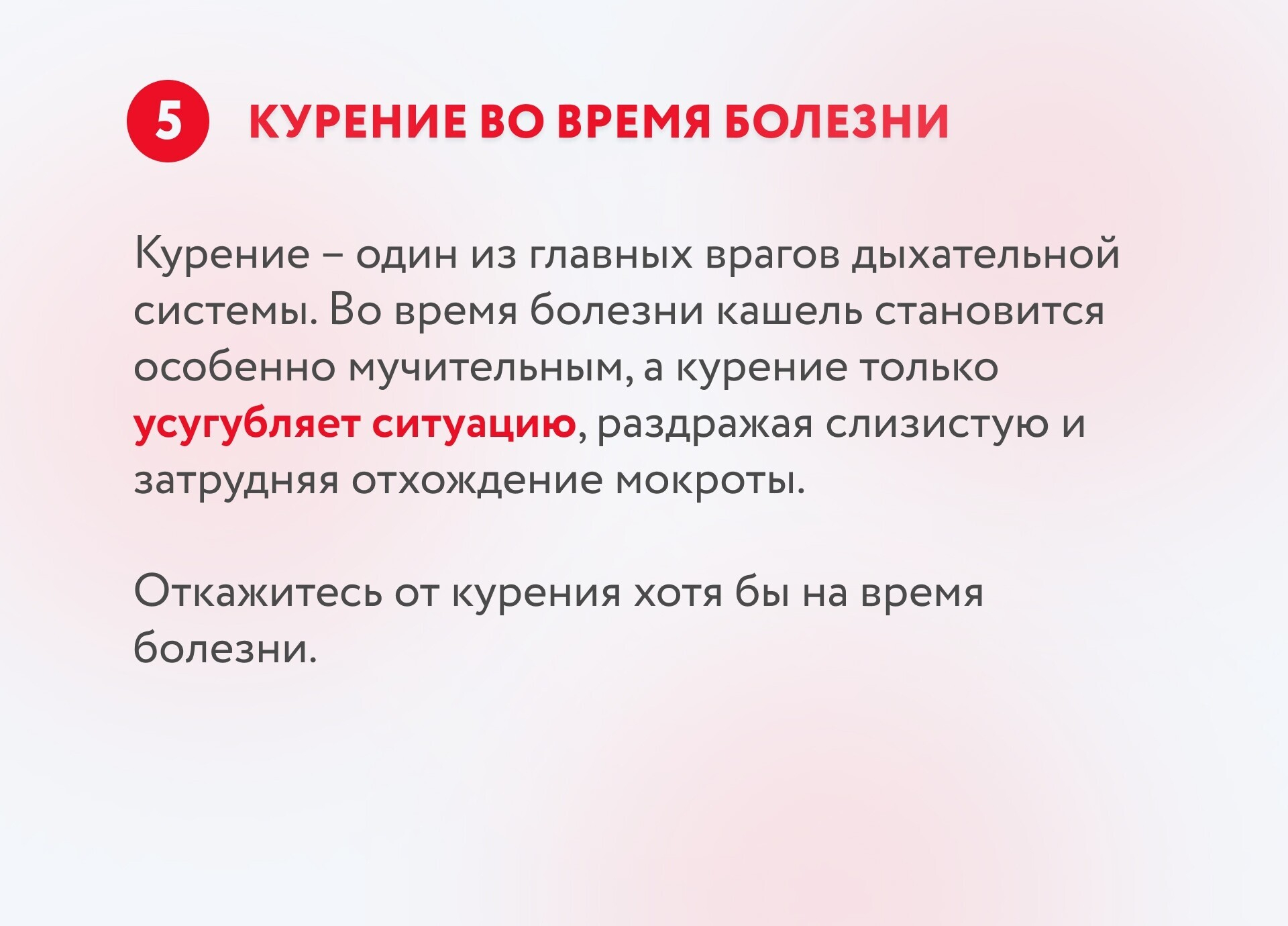 – Курение и вейпинг могут серьезно усложнить лечения кашля и даже спровоцировать более серьезные осложнения. Из-за болезни поврежденный эпителий плохо справляется с защитой от инфекций. Нелегко приходится и иммунитету, он и так борется с инфекцией.