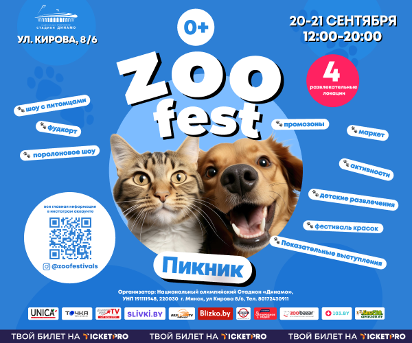 20–21 сентября 2025 года на территории Национального олимпийского стадиона «Динамо» (ул. Кирова, 8/6) пройдет «ZOO fest: Пикник». Это большой фестиваль для всех любителей домашних животных и яркое завершение фестивального сезона.