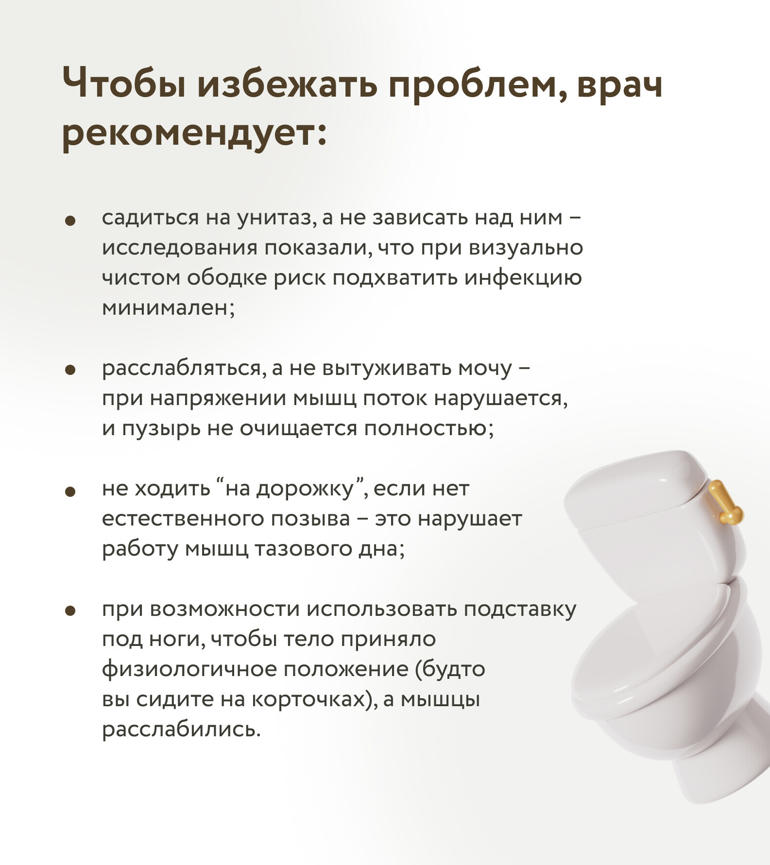 «Многие привыкли “нависать” над унитазом, особенно в общественных туалетах, или тужиться, чтобы “побыстрее”. Иногда это мешает мышцам тазового дна полностью расслабиться, и мочевой пузырь не опорожняется до конца. Постоянная такая привычка может со временем создать предпосылки для появления цистита», – объясняет Мария Такунова.
