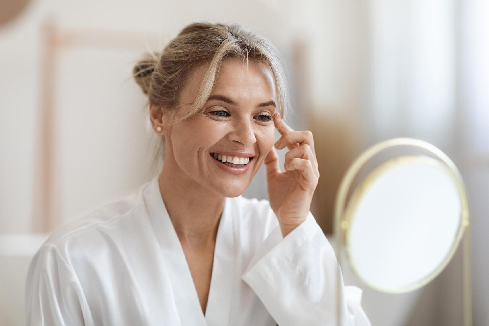 Выработка коллагена снижается вместе с уровнем половых гормонов. К моменту наступления менопаузы структура кожи и её внешний вид начинают портиться. Жировая клетчатка на лице и шее истончается, появляются глубокие морщины, с которым не справляется косметика для ухода.