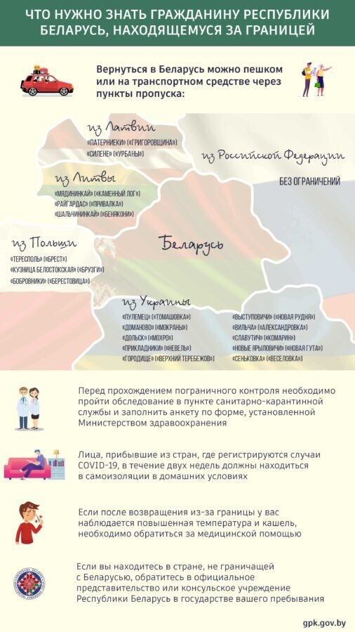 Инфографика содержит информацию о перечне функционирующих пунктов пропуска сопредельных стран на границе с Беларусью, способы возвращения белорусов и иностранных граждан к постоянному месту жительства, рекомендации по порядку пересечения границы и прохождения санитарно-карантинного контроля в пунктах пропуска и сведения о транзите через территорию Беларуси.