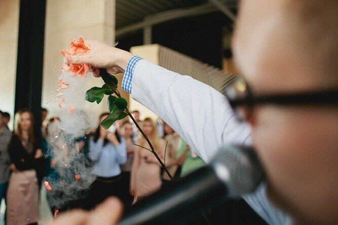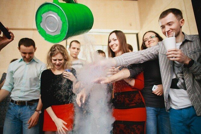 Следующим сюрпризом для гостей вечеринки стал дуэт медиков-химиков, ставивших удивительные и, прямо скажем, небезопасные эксперименты прямо на приглашенных. Ответственно заявляем: от вылитого на руки жидкого азота никто не пострадал.