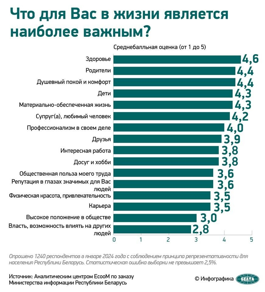 Наименее важными сторонами своей жизни белорусы назвали карьерные устремления, высокое положение в обществе и власть. На последнем месте оказалась возможность влиять на других людей.