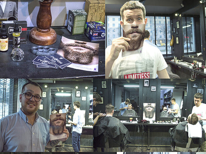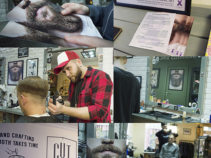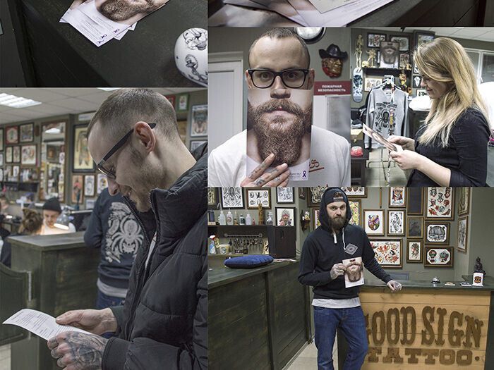 На наш призыв откликнулись и активно поддержали социальную акцию ребята из двух столичных барбершопов — CUT и FIRM. Теперь, зайдя к ним, вы сможете не только сделать стильную стрижку, но и взять наши флаеры и узнать больше о самодиагностике рака яичка. Нас также поддержала тату-студия GOOD SIGN TATTOO. Бородатые визуалы отлично вписались в их брутальный интерьер.