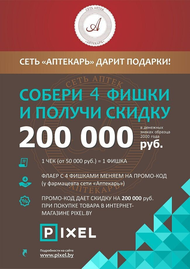 С 15 мая по 30 июня совершайте покупки в сети аптек «Аптекарь» и получайте скидку 200 000 руб. на покупку в интернет-магазине pixel.by.
