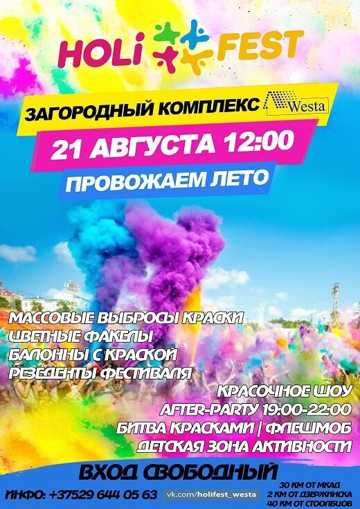 В воскресенье 21 августа в 12:00 на площадке у озера в спортивно-оздоровительном комплексе «Веста» будет много разукрашенных людей. И ты можешь стать одним из них!