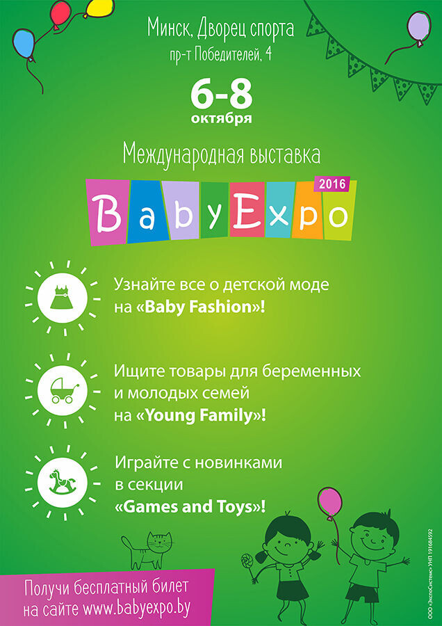 6-8 октября в минском Дворце спорта пройдет выставка индустрии детских товаров и услуг BabyExpo (БейбиЭкспо). Это большой семейный праздник с сюрпризами и подарками для посетителей.