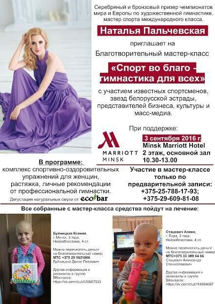 3 сентября 2016 года в Minsk Marriot Hotel в 10.30 состоится благотворительный мастер-класс «Спорт во благо. Гимнастика для всех». Наталья Пальчевская — ведущая мастер-класса, серебряный и бронзовый призер чемпионатов мира и Европы по художественной гимнастике, мастер спорта международного класса.