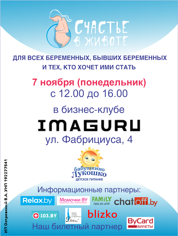 Очередное мероприятие состоится 7 ноября в бизнес-клубе IMAGURU (ул. Фабрициуса, 4, район метро Институт Культуры) c 12 до 16 часов. Интересные выступления, маркет с нужными и полезными товарами, красивые фотографии и много неформального общения – все это будет и на предстоящем празднике. Образовательная программа «Счастья в животе», на которой лучшие специалисты в своих областях выступят с самыми актуальными темами, заслуживает отдельного упоминания.