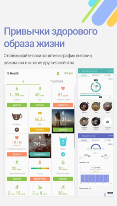 Фитнес-приложение, разработанное компанией Samsung, в фоновом режиме следит за активностью пользователя в течение дня с помощью шагомера и термогигрометра (определитель температуры и влажности). Встроенные датчики приложения фиксируют сердечный ритм, уровень давления, пульс, глюкозу в крови, а также контролируют количество потребляемых калорий.