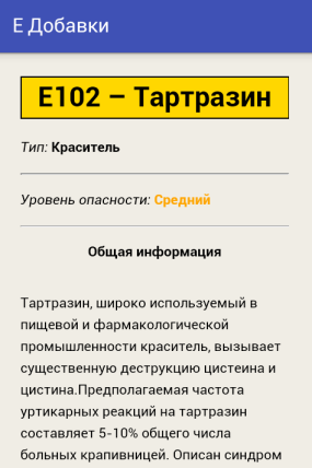 Кликнув на любое «Е» из списка, вы получаете информацию об источнике возникновения, свойствах и местах, где встречается добавка. Приложение дает информацию о степени вредности элемента. Очень опасные добавки дополнительно содержат сведения о возможных симптомах после их употребления.
