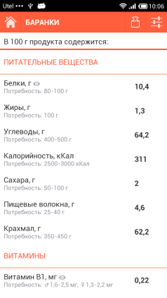 Если перед вами встал выбор, съесть на обед картофель или макароны, приложение сравнит два продукта между собой и сообщит вам о более выгодном варианте. Также в главном меню вы сможете узнать лидеров по содержанию того или иного витамина, микро- или макроэлемента.