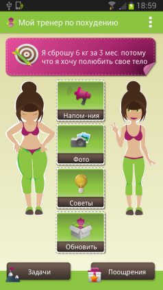 Приложение не столько информирует или контролирует, сколько выполняет мотивационную функцию. Каждый пользователь получает аватар (свое графическое тело), на примере которого может видеть, как меняется его собственное тело в период похудения. Игриво-мотивирующее приложение дает возможность установить целевой вес и посмотреть, как вы будете выглядеть по его достижению. «Мой тренер по похудению» имеет забавную функцию «SOS чувство голода». Если плохое настроение или скука тянет пользователя на неполезные вкусности, стоит всего лишь нажать кнопку и на экране появится отрезвляющее напоминание, что еда не сделает вас счастливее, а плохое настроение исправит звонок близкому.