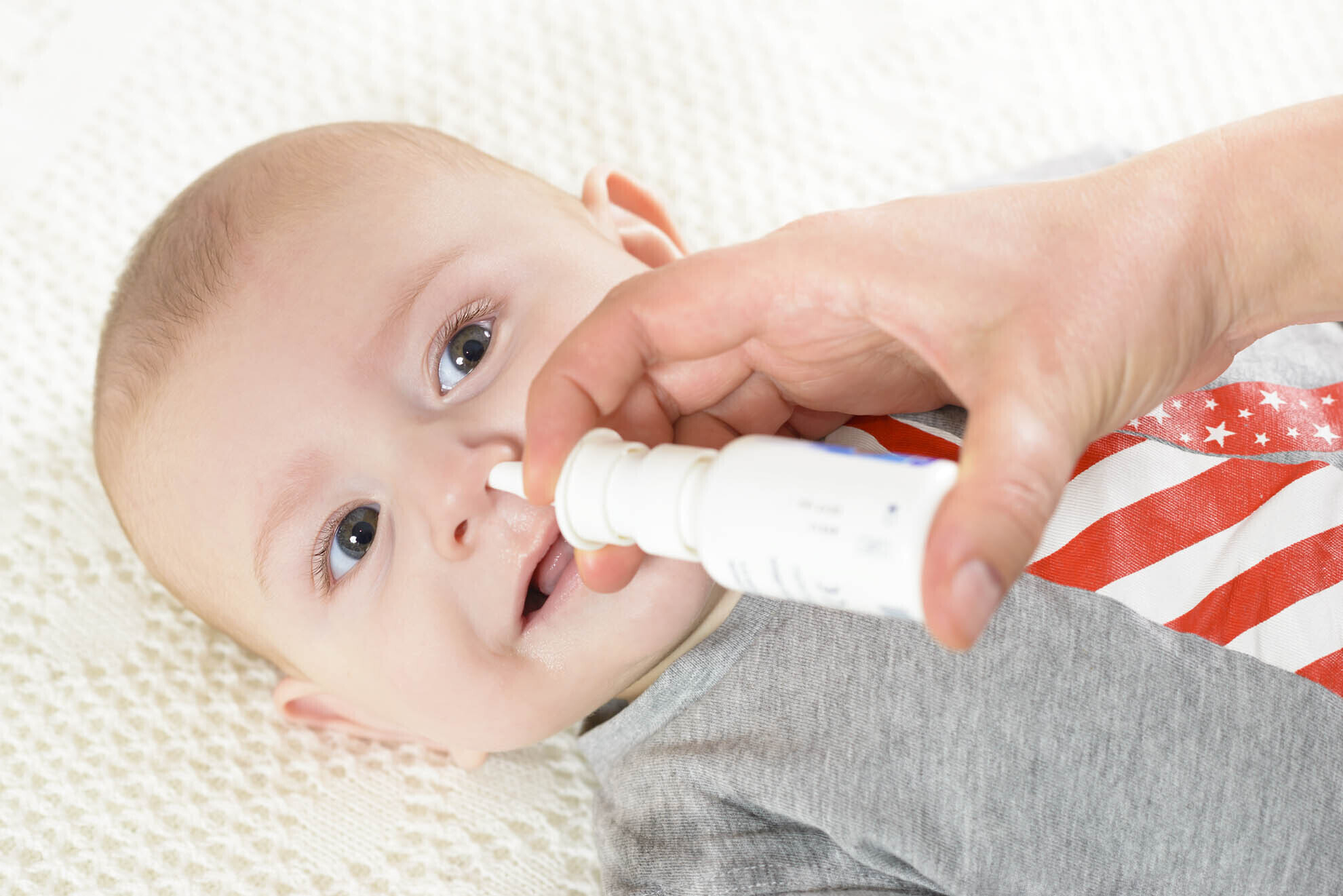 Ребенок должен находиться в полулежачем положении на боку. Раствор впрыскивается в ту ноздрю, которая находится сверху. Наконечник бутылочки при этом направляем к внутреннему уголку глаза, чтобы струя не травмировала носовую перегородку.