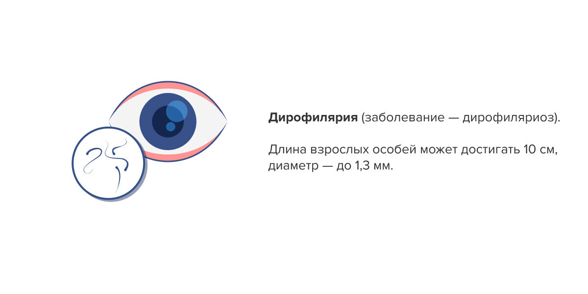 Также дирофилярии у человека могут локализоваться под кожей век, в слизистой оболочке, под конъюнктивой, в глазном яблоке.
