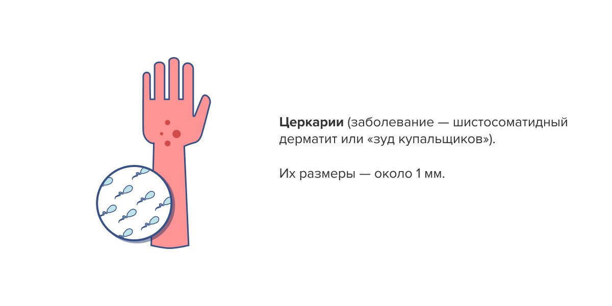 Как заражаются люди? Кормят уток, лебедей, в стоячей воде у берега, где водная растительность и ползают улитки (промежуточные хозяева этих личинок). Церкарии выходят из заднего прохода птицы, быстро движутся к улиткам, а потом выходят из улиток и снова ищут что-то теплое, подвижное. Им может оказаться человек. Буквально за 10 минут они проникают под кожу — и у человека возникает сыпь.
