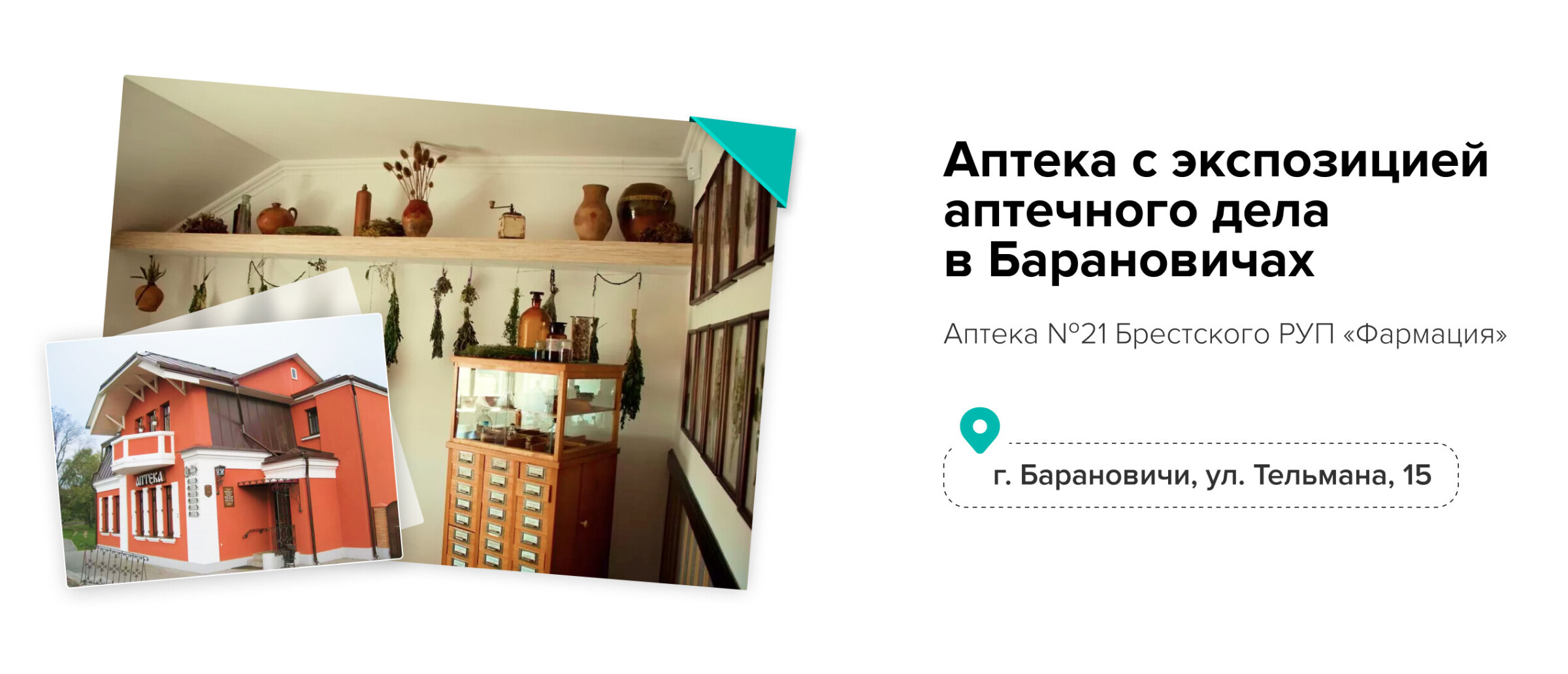 Аптека находится в здании, которое включено в реестр историко-культурных ценностей Республики Беларусь. И здесь есть интересная историческая экспозиция. Большинство экспонатов относится к ХХ веку, хотя есть редкие представители ХIX и даже XVIII столетий. К примеру, в воссозданном рабочем кабинете заведующего аптекой вся мебель — старинная. Здесь можно посмотреть книги по фармации и документы, написанные чернилами.