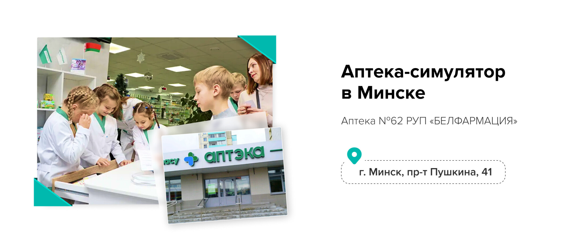 На базе аптеки №62 действует первая в стране аптека-симулятор «Юный фармацевт», где дети могут познакомиться с профессией фармацевта. Здесь нет настоящих лекарств, зато имеются упаковки игрушечных лекарств, игрушечная касса, весы и ступка для имитации процесса изготовления медпрепаратов. Есть рабочее место врача. За отдельным столом можно изучать биологию и анатомию человека.