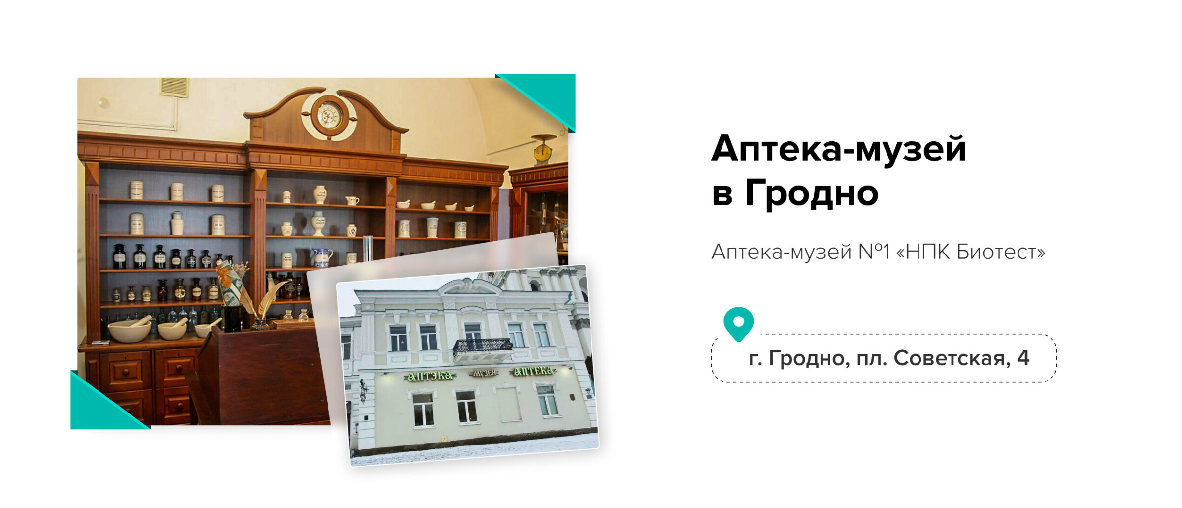 Это первая аптека в Гродно: упоминается еще в 1687 году. Она существовала, несмотря на войны, катаклизмы и смену владельцев, до 1950-х. Потом какое-то время здесь был аптечный склад, затем салон мебели. Возродилась аптека в 1996 году, когда часть первого этажа ее исторического здания арендовала и отреставрировала гродненская фармацевтическая фирма «Биотест». С тех пор в старинных залах вместе действуют аптека и музей.