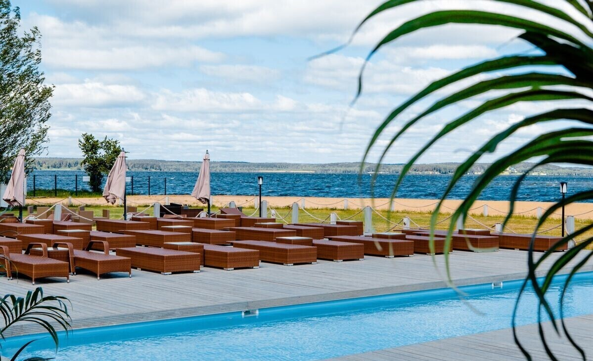 Здесь вас ждут два открытых бассейна. На террасе с шезлонгами и столиками можно отдохнуть и перекусить — рядом есть Lounge Bar и ресторан.