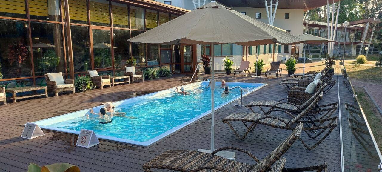 Размер открытого бассейна – 10 х 3,5 м, глубина – до 1,5 м. Отдых на летней террасе, где он расположен, входит в стоимость посещения аквазоны санатория. Гости также могут воспользоваться услугами русской бани, турецкой сауны и джакузи. Есть детский бассейн.
