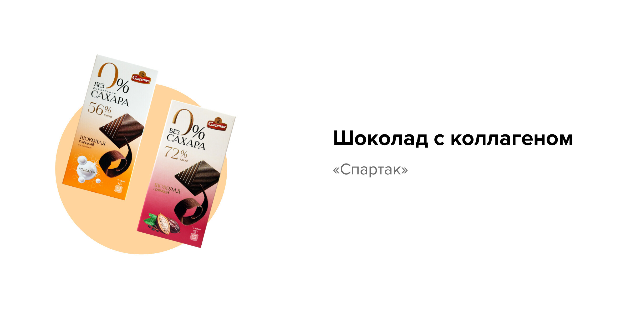В данном продукте тоже нет сахара, но это здесь не самое интересное. В шоколад добавили коллаген. Он гидролизованный — все как положено. Разумеется, этого количества недостаточно, чтобы, к примеру, ваша кожа стала более упругой. Тем не менее дополнительная доза коллагена не помешает.