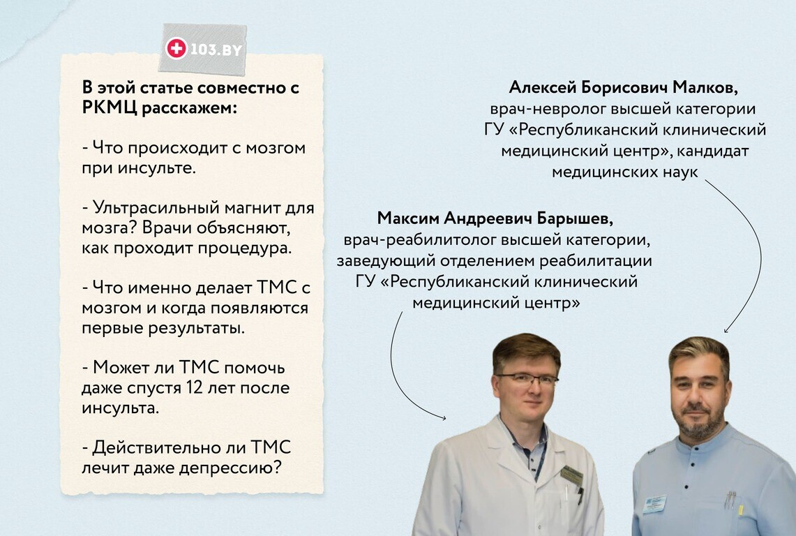 О таком комплексном подходе 103.BY рассказали специалисты Республиканского клинического медицинского центра: заведующий отделением реабилитации Максим Барышев и врач-невролог Алексей Малков.