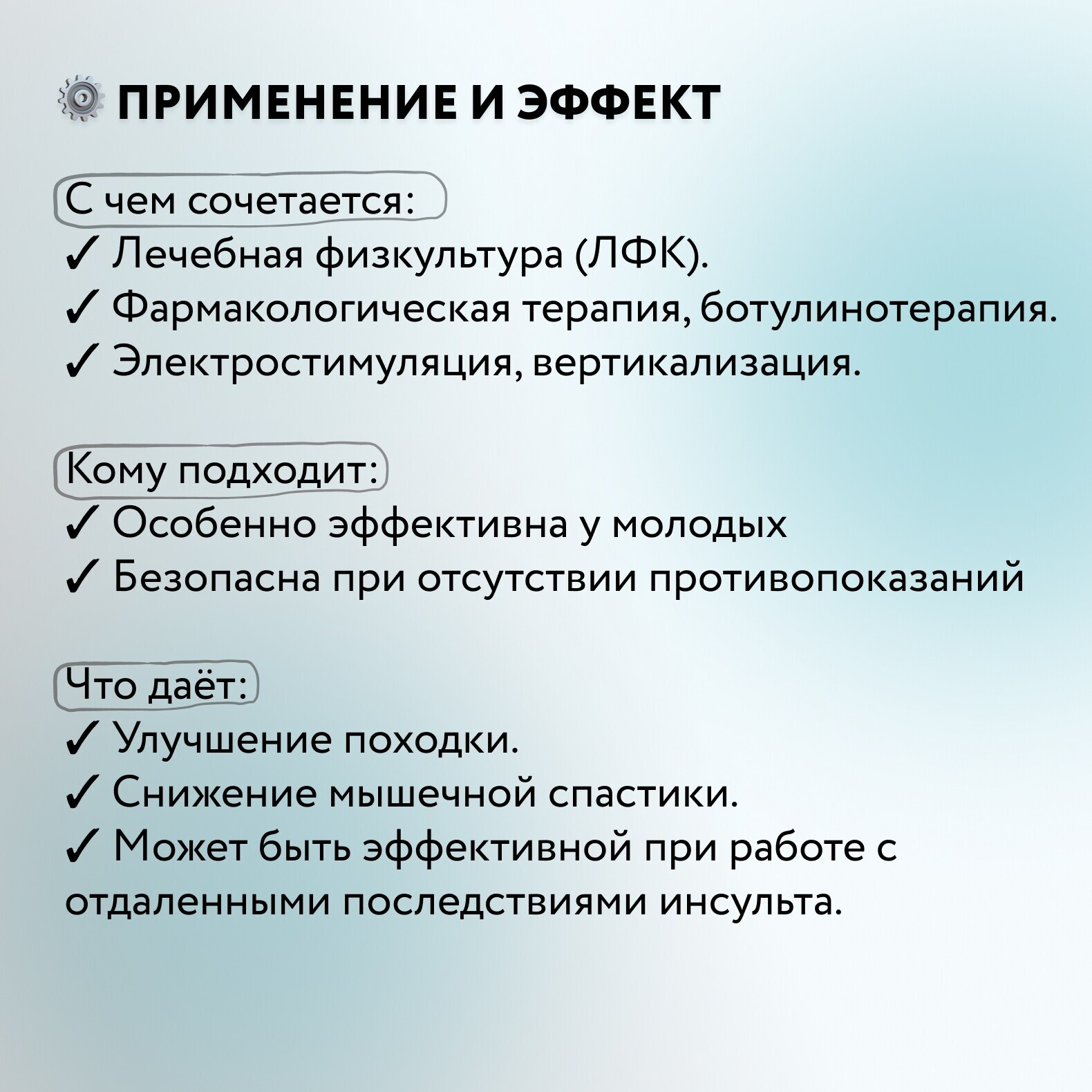 И в любом случае улучшение походки, снижение спастики (повышенного мышечного тонуса, который затрудняет движение) происходят не сразу, эффект может быть отсроченным.