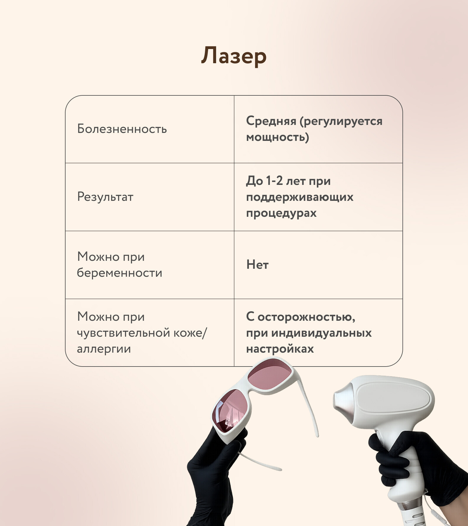 Плюсы: метод подходит для всех типов кожи и волос; при правильной технике можно добиться пожизненного эффекта.