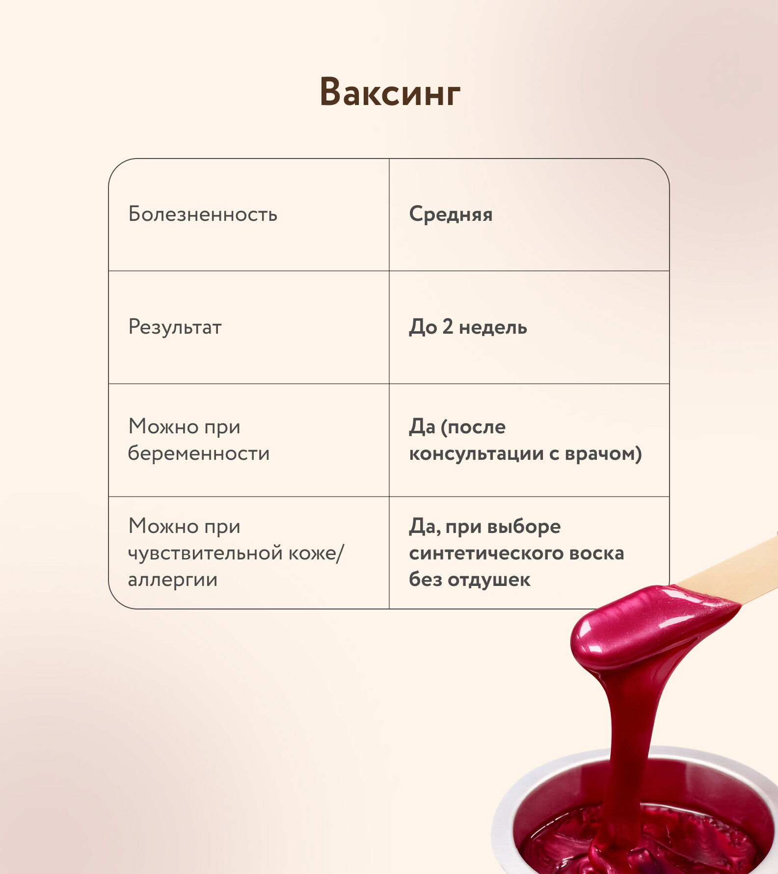 «Считается, что ваксинг – более скоростной метод, поэтому, если вам важно сделать процедуру побыстрее, выбирайте его. В среднем комплекс ноги+бикини+подмышки занимает 60 минут», – рассказывает эксперт депиляции.