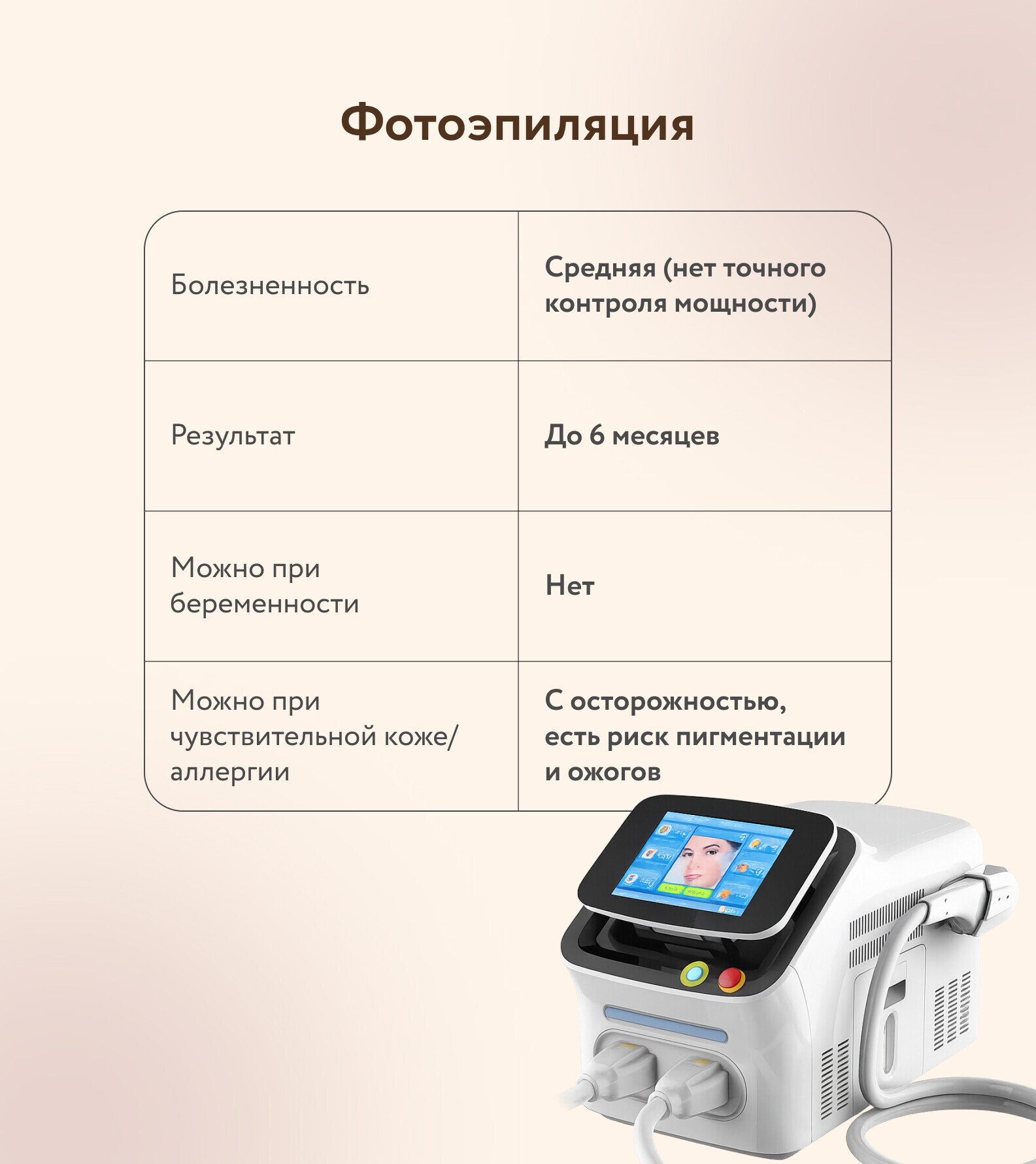- «Если у вас толстый темный волос и светлая кожа, можно попробовать фотоэпиляцию. В редких случаях эффект будет сопоставим с лазерной. Но вы должны осознавать ответственность и степень риска».