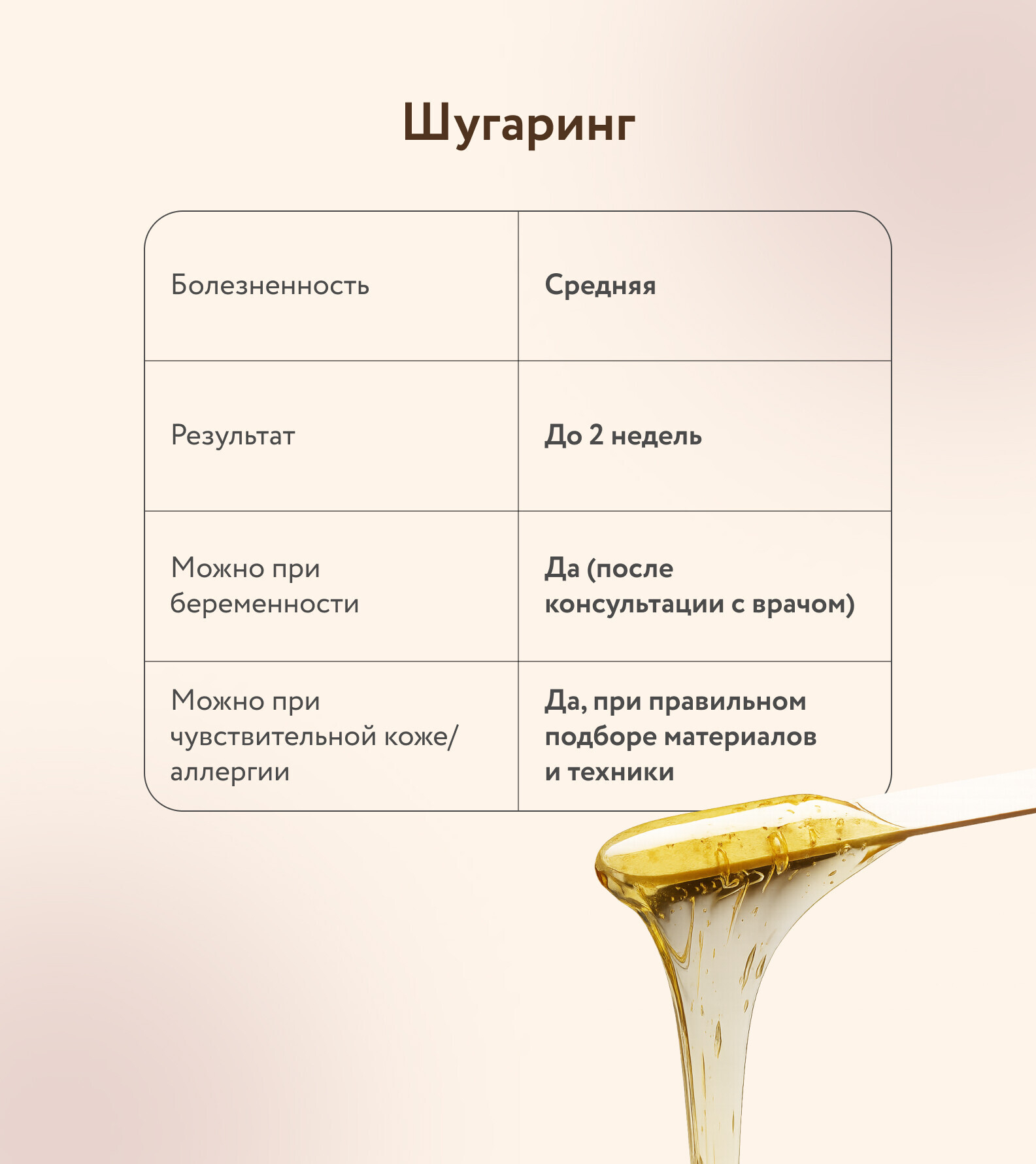 Шугаринг подойдет для тех, у кого тонкий волос умеренной длины (от 3 до 5 см), кожа склонна к сухости и вы термочувствительны, так как сахарная паста лишь слегка теплая и очень комфортна по температуре», – заключает эксперт депиляции Ольга Борисевич.