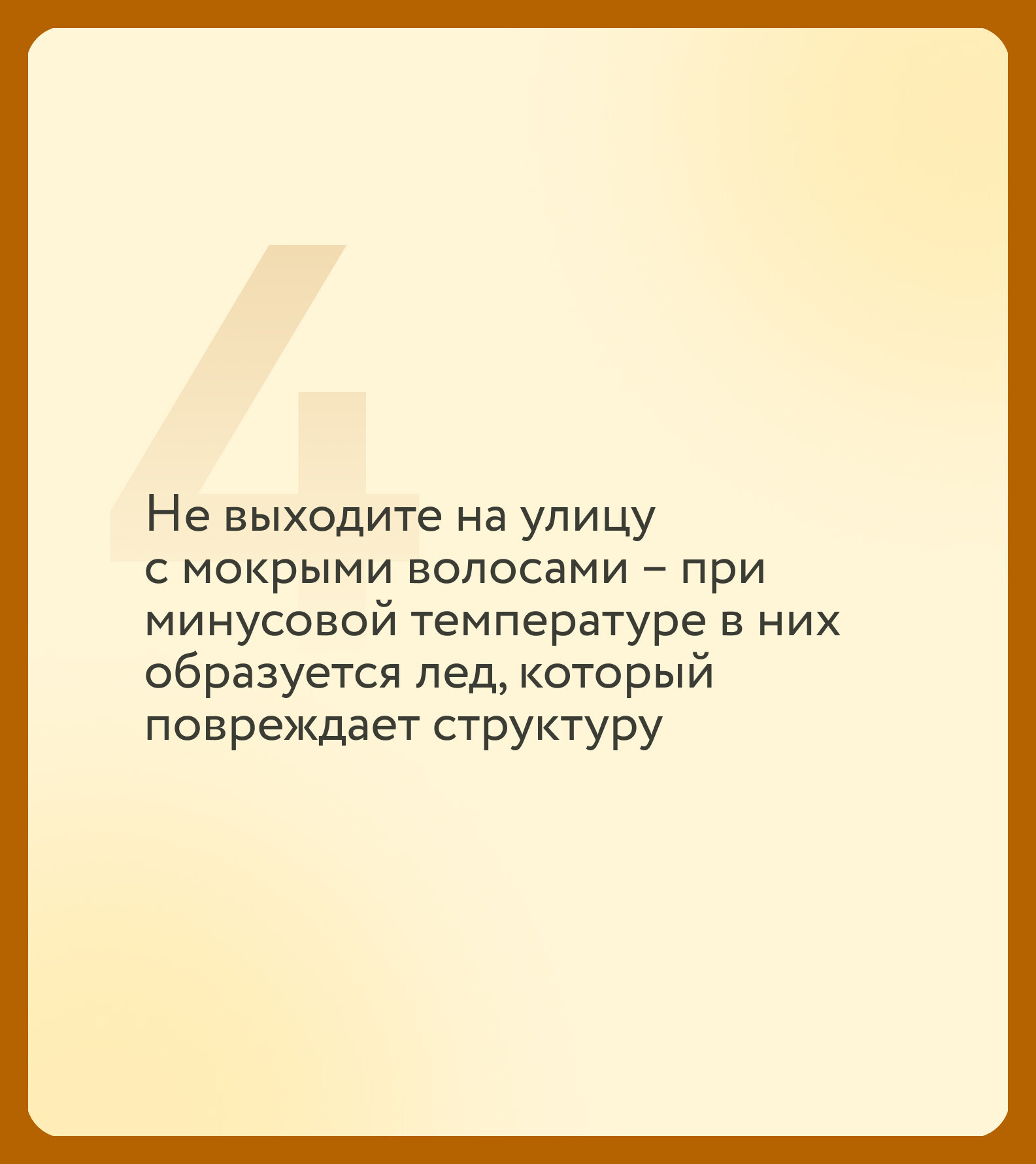 И главный совет напоследок – относитесь к волосам бережно. Не трите их полотенцем, не ложитесь спать с мокрой головой и не прячьте под шарф.