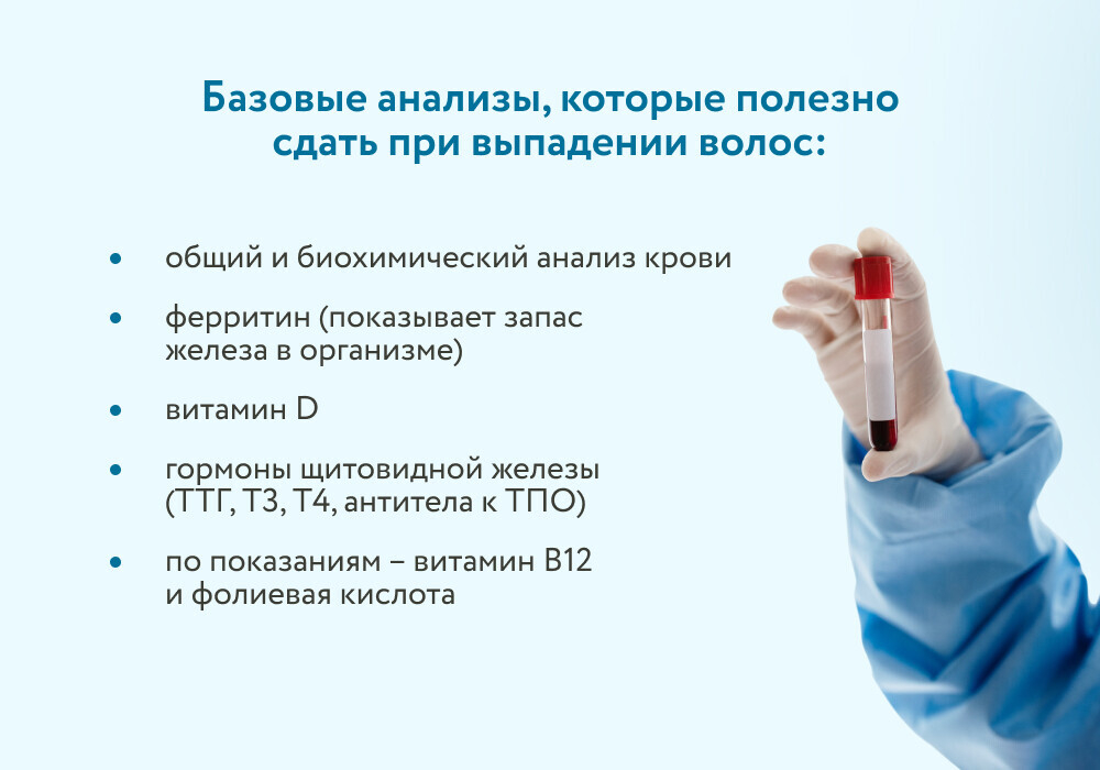 «Это минимальный набор, с которого можно начать. Он показывает общее состояние организма и помогает понять, откуда растут корни проблемы – в буквальном смысле», – отмечает трихолог.