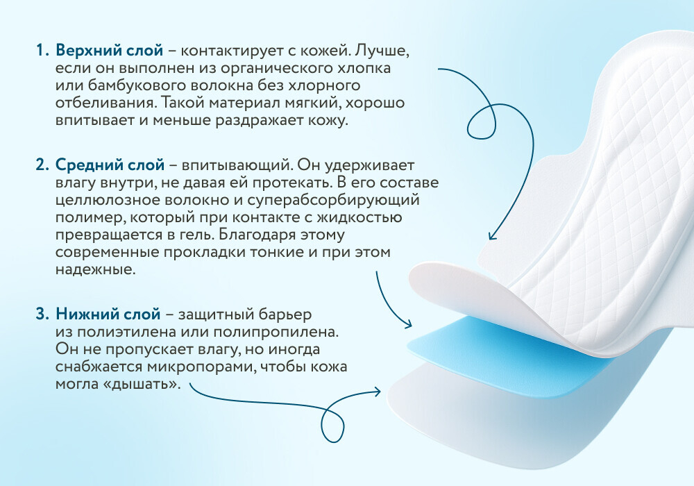 Впитывающая зона обычно состоит из нескольких слоев: внутренний быстро проводит влагу, средний удерживает ее, а внешний предотвращает протечки. Некоторые модели имеют дополнительный «карман» для вкладыша, чтобы увеличить защиту в дни обильных выделений.