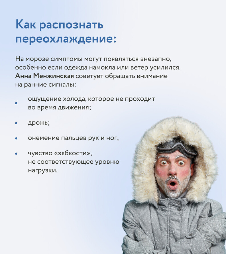 «Перчатки лучше выбирать из мембранных материалов, которые отводят влагу. Голову тоже нужно утеплить, но важно не перегреться. Синтетические материалы для спорта предпочтительнее хлопка, они не копят влагу», – рассказала Анна Менжинская.