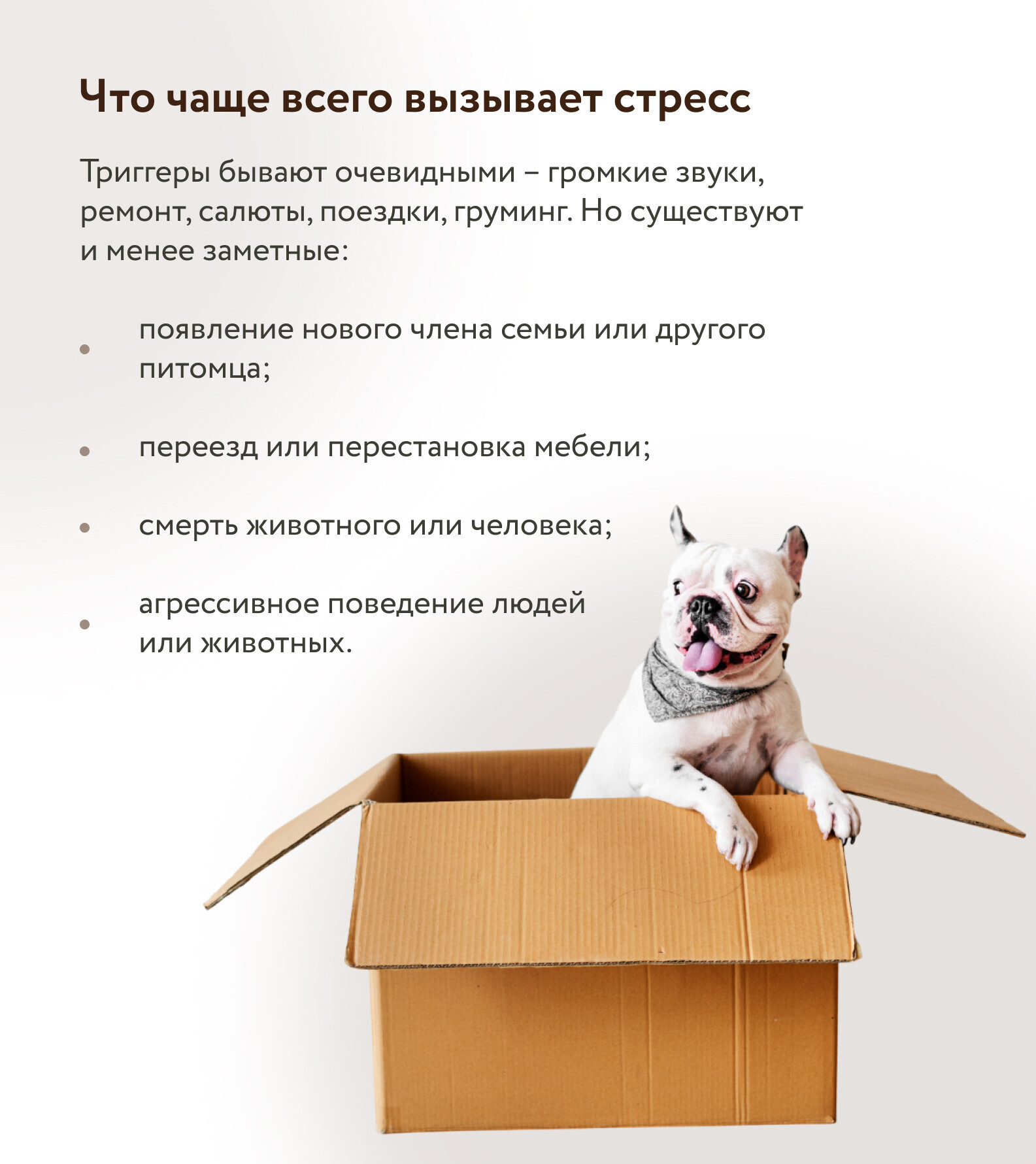 Стрессовые ситуации у животных бывают разными по силе и длительности. Перелеты, груминг, визит к ветеринару, длительные поездки, реабилитация после травм – все это может быть серьезной нагрузкой для нервной системы, особенно если у питомца уже есть тревожность или негативный опыт.