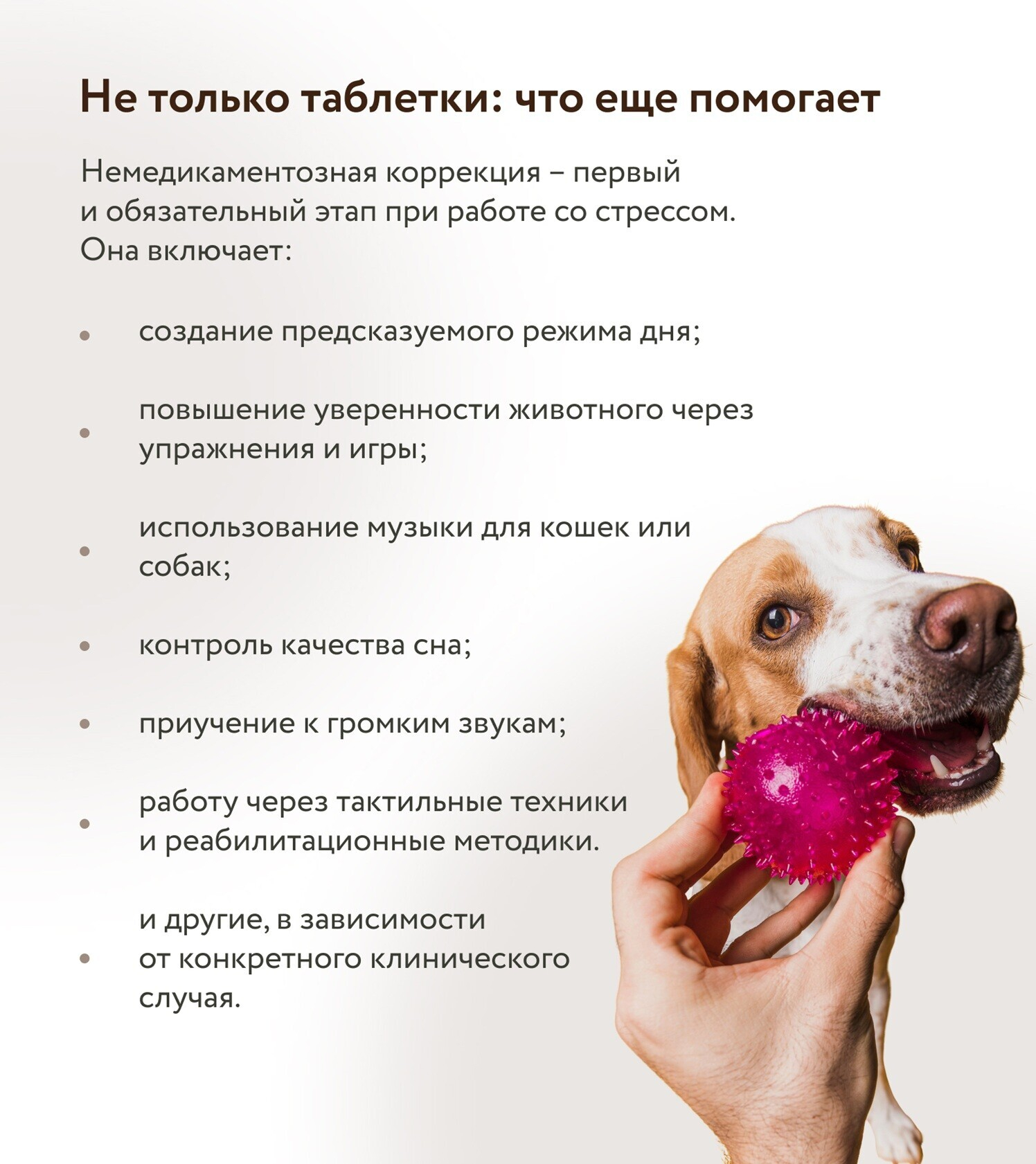 Таблетки могут временно снизить тревогу, но не научат питомца справляться с ситуацией. В таких случаях лечением становится комплекс: работа над поведением, изменение среды, поддержка уверенности, возможные препараты – и только под контролем специалиста.