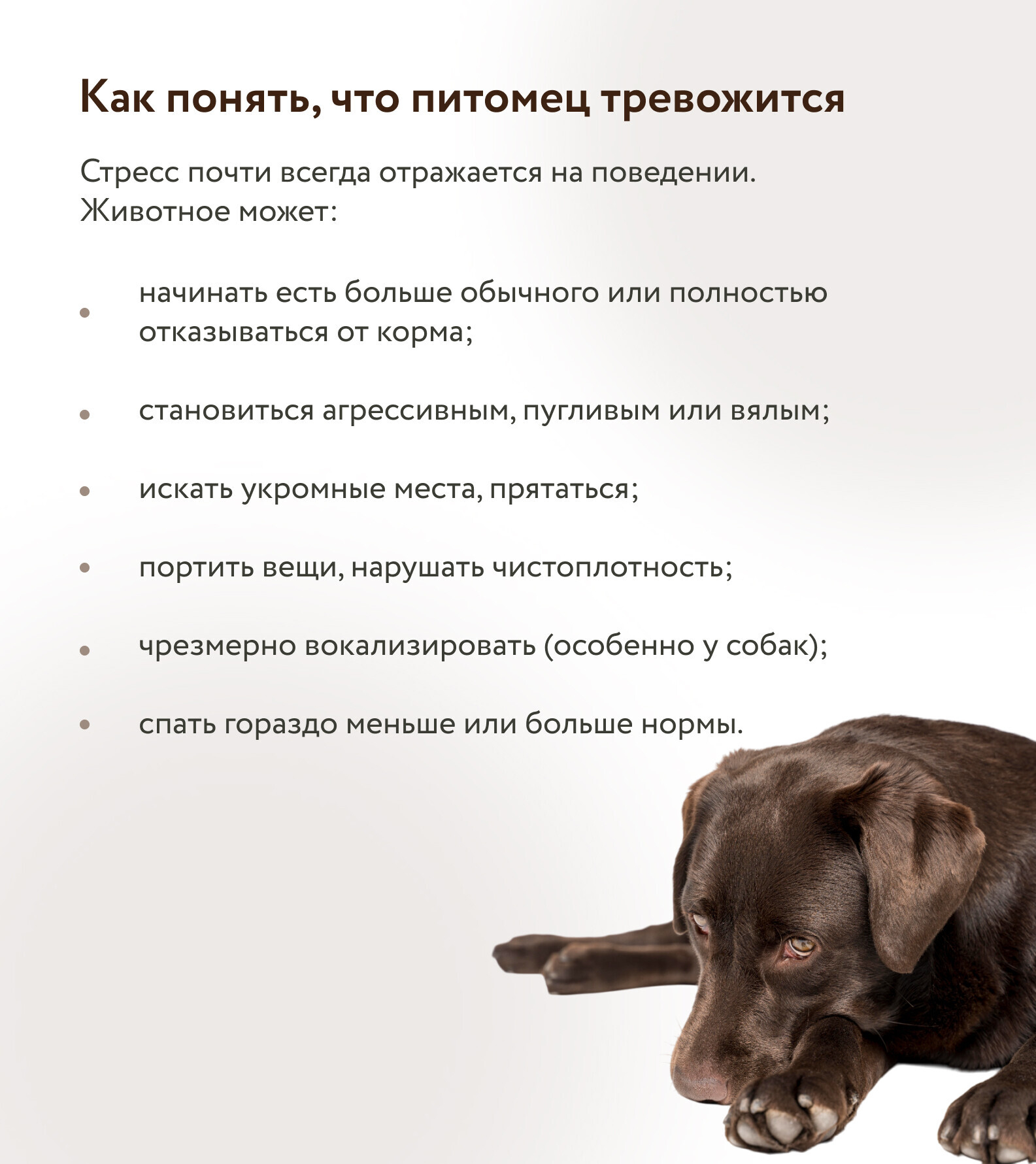 «Владельцы чаще обращают внимание именно на физиологию: дрожь, тяжелое дыхание, зажатую позу. Но поведенческие изменения – не менее важные сигналы», – подчеркивает врач.